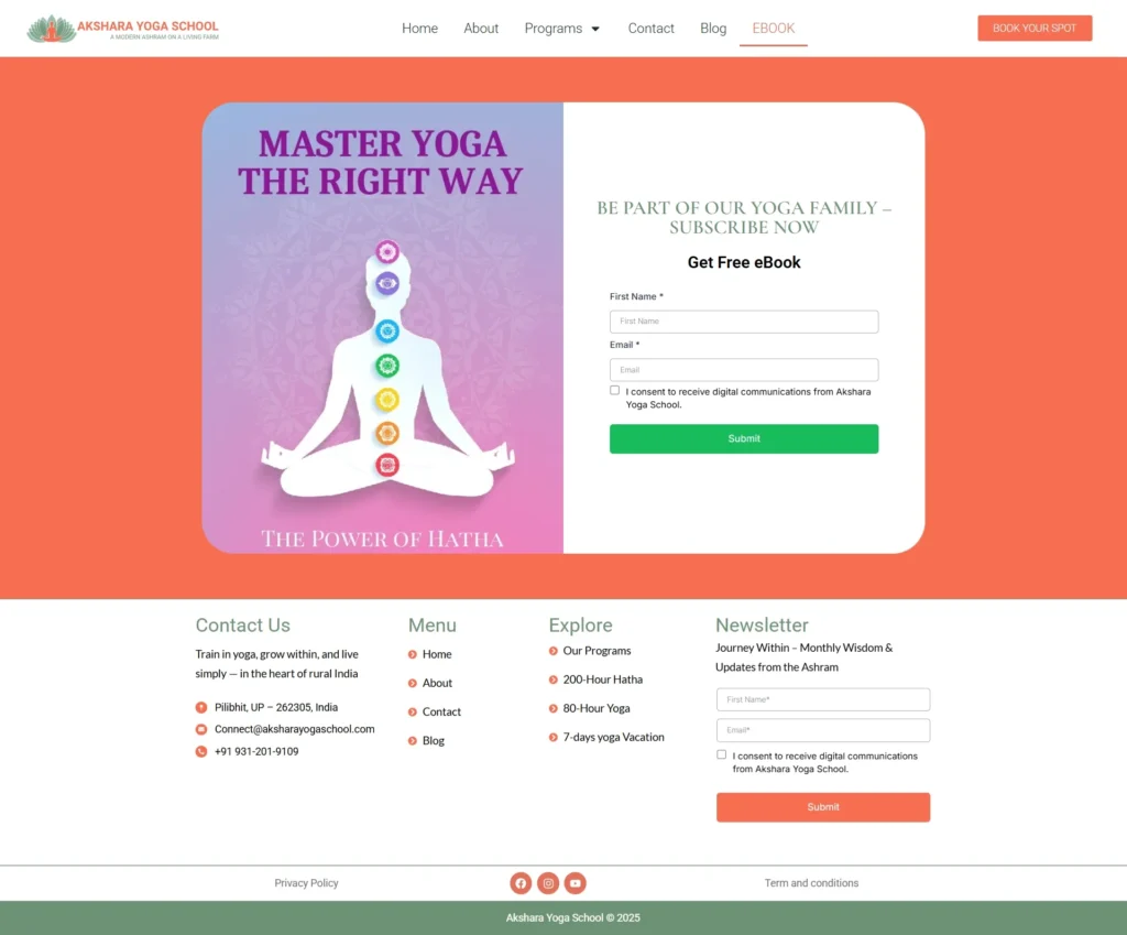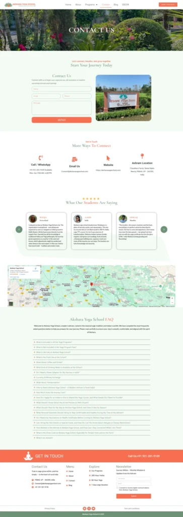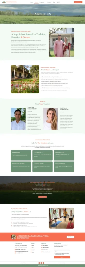 We designed a serene and soul-centered website for Akshara Yoga School, a rural ashram in Northern India led by a devoted yogic couple. The site reflects their commitment to authentic Hatha Yoga, spiritual depth, and nature-based living. With clean, calming visuals and intuitive navigation, the website highlights their personal approach, small-group teaching style, and deep roots in traditional Indian yoga. It invites visitors into a high-vibration environment where transformation begins—not just on the mat, but in life.