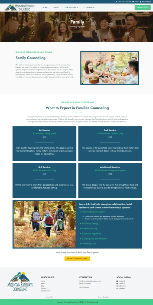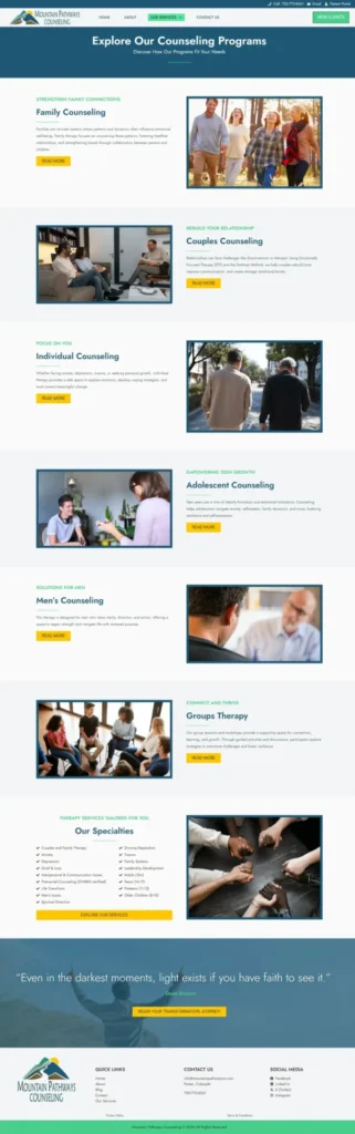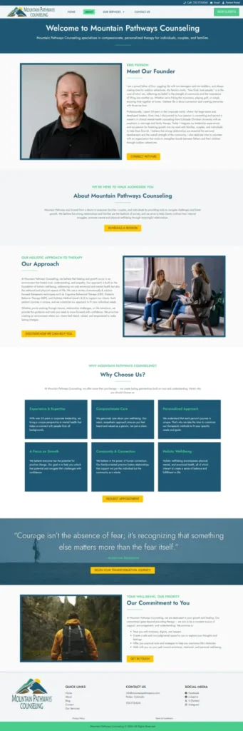 We created a dynamic and visually engaging website for an agency that emphasizes the founder’s personal and professional journey, highlighting their core values of family, community, and personal growth. The website seamlessly integrates their story, expertise in counseling, and dedication to fostering strong relationships. It features an inviting design, user-friendly navigation, and rich content that showcases their passion for helping individuals, couples, and families flourish. The platform also highlights their commitment to community through volunteer work, connecting visitors with resources and inspiration for personal and relational growth.