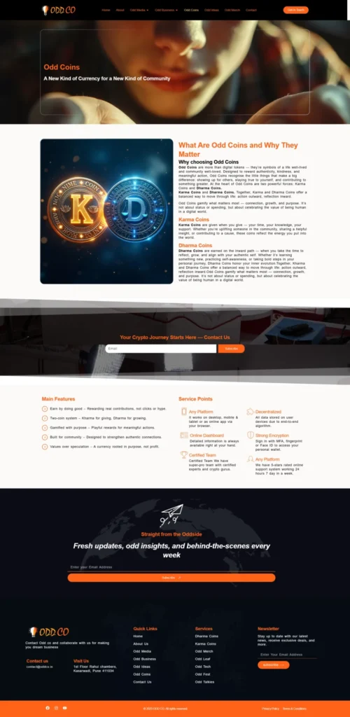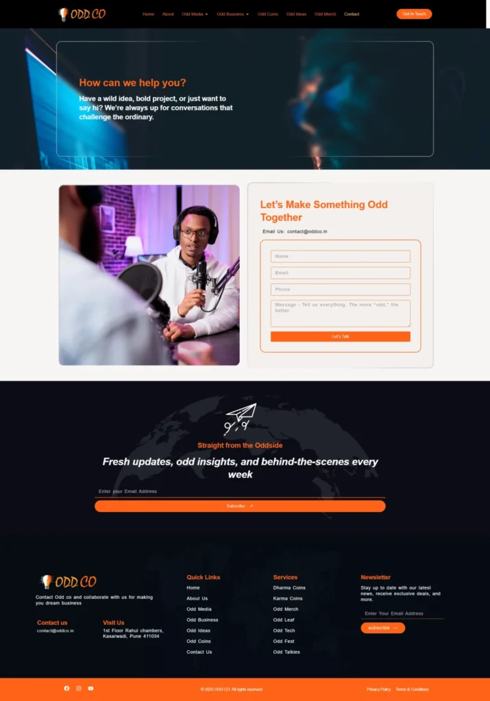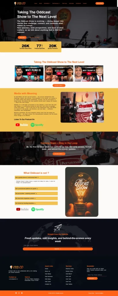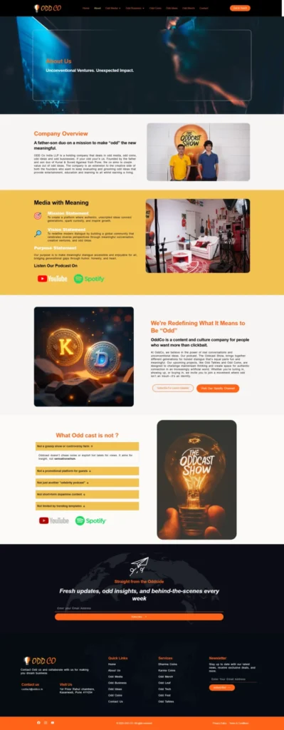 We created a bold and immersive website for ODD Co India LLP—a multi-venture platform rooted in creativity, generational dialogue, and authentic expression. The site brings to life the father-son duo’s vision of celebrating the unconventional through engaging media, purpose-driven ventures, and community-first innovation. With quirky visuals, clean structure, and storytelling at its core, the website showcases Odd Co’s diverse ecosystem—from unscripted podcasts and documentaries to digital currency and conscious commerce—inviting curious minds to explore, connect, and create with heart.