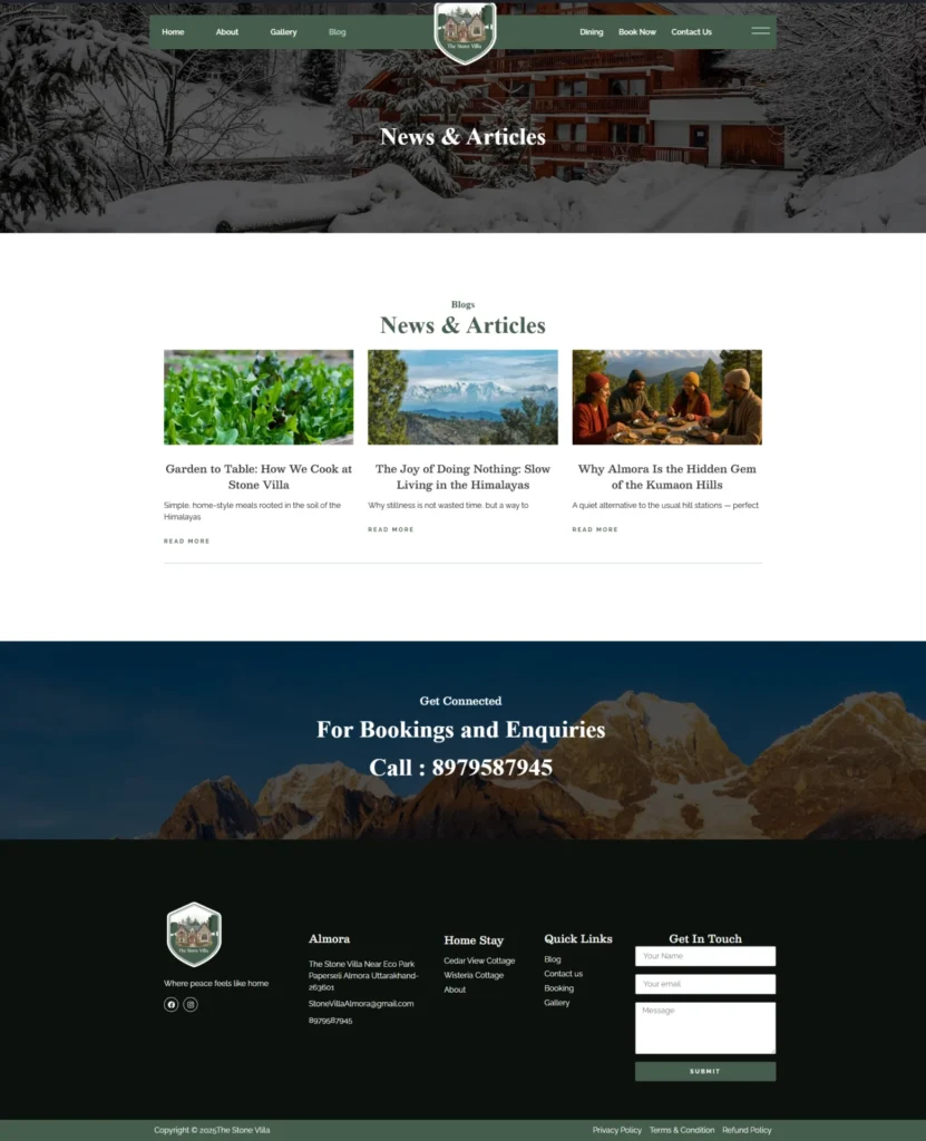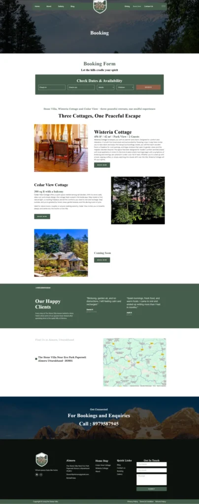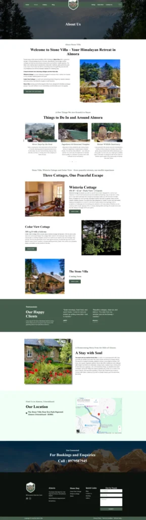 We designed an immersive and welcoming website for Stone Villa, a Himalayan homestay rooted in simplicity, nature, and heartfelt hospitality. The site brings to life the personal story of its founders—Two local—who returned to their hometown of Almora to create a space that feels like a true homecoming. Blending their deep connection to the land with modern comforts, the website highlights their values of slow living, community, and meaningful rest. Visitors can explore Stone Villa’s thoughtfully built cottages, organic gardens, and soulful surroundings through an intuitive, story-driven layout.
